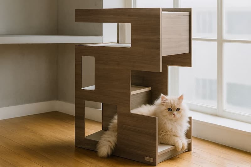 天然木ラバーウッドで作られた、幾何学模様のようなユニークなデザインが素敵なキャットタワーです。見晴し台、ハンモック、宇宙船、隠れ家を備え、多頭飼いにも対応しています。