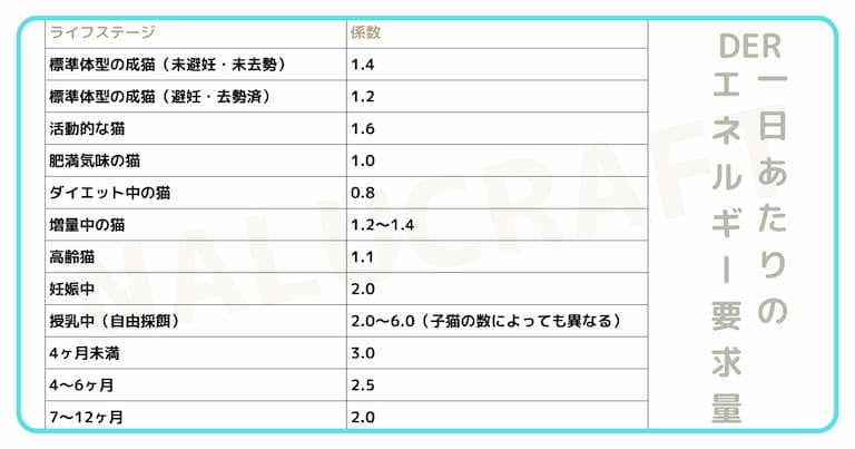 あなたの猫に当てはまる係数を確認しましょう。