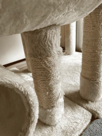 低いほうのキャットタワーの麻ひもは質が悪いのか、すぐにポワポワした繊維が飛び出してしまい、見つけるたびにハサミで切っていました。