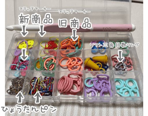 - 編み物初心者で、100均の引っ掛けるだけの段数マーカーを使ってましたが、いつの間にか外れて、目がわからないと言う事が多々ありで… こちらを使用してからは、ロックがかかるので外れる事なく、助かってます。 大きさもいろいろあって使いやすい。 ケース付きで収納もバッチリです。(楽天レビューより)
