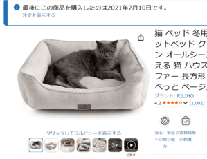 実際買ったベッドの後継種になります。購入したベッドはとってもしっかりした作りで、綿もパンパンに入っていたので飼い主もじゅにあも満足のベッドでした。