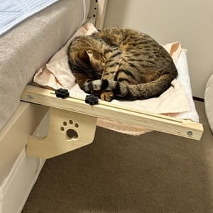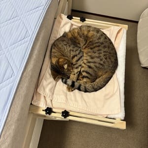 最近では、朝になると窓辺のハンモックにいることが多く、夜は人間のベッドのすぐ横に置いた猫用ベッドで眠るスタイルに落ち着いています。