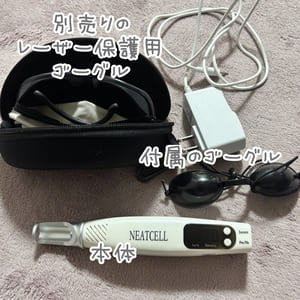 私が今回使用したものです。付属のゴーグルでは目の保護に不安があったので、別のゴーグルを買いました。しかし、大きすぎて頬の上のほうのシミにアクセスしづらいのが難点。