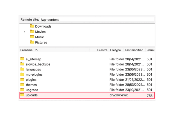 アップロードフォルダのパーミッションを確認